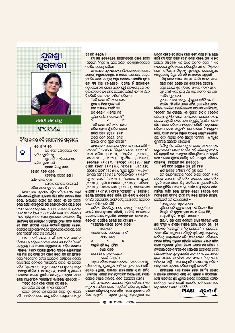 ଯୁଗଶ୍ରୀ ଯୁଗନାରୀ ମାସିକ ମହିଳା ଓଡ଼ିଆ ସାହିତ୍ୟ ପତ୍ରିକାର ଅଗଷ୍ଟ ୨୦୨୫ ସଂଖ୍ୟାର ପ୍ରଚ୍ଛଦପଟ୍ଟରେ ଅଛନ୍ତି ଶିକ୍ଷାବିତ ପ୍ରଫେସର ଡ଼ ତୃପ୍ତି ମହାନ୍ତି ।