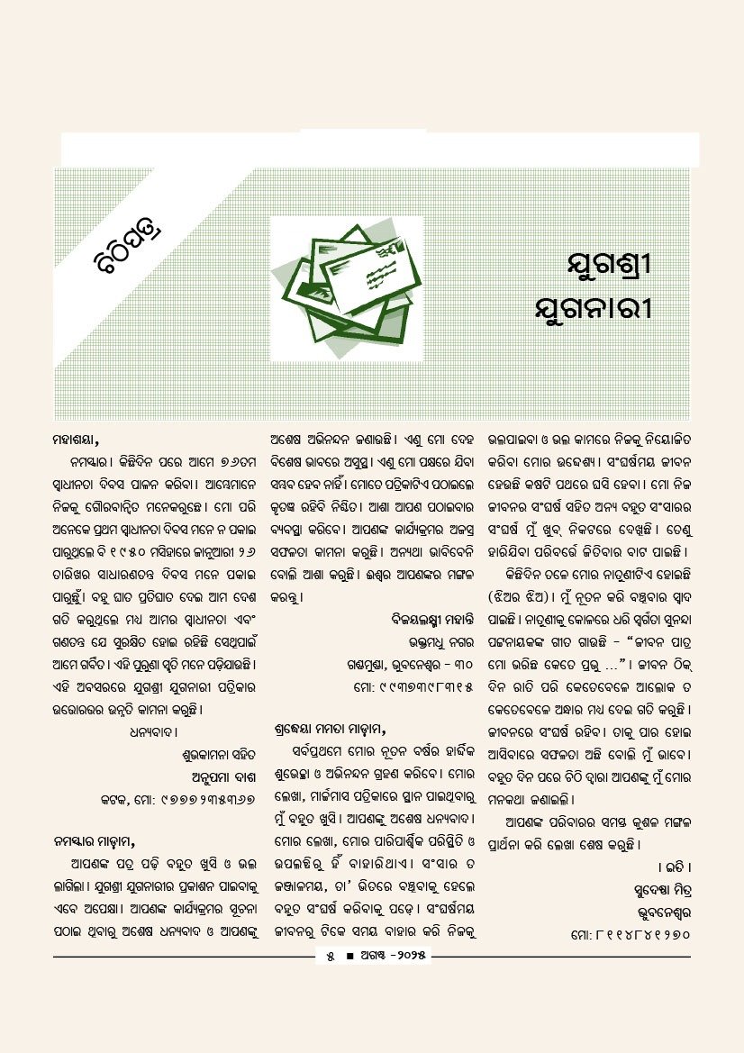 ଯୁଗଶ୍ରୀ ଯୁଗନାରୀ ପରିବାର ପକ୍ଷରୁ ତାଙ୍କୁ ଅନେକ ଅଭିନନ୍ଦନ ।
