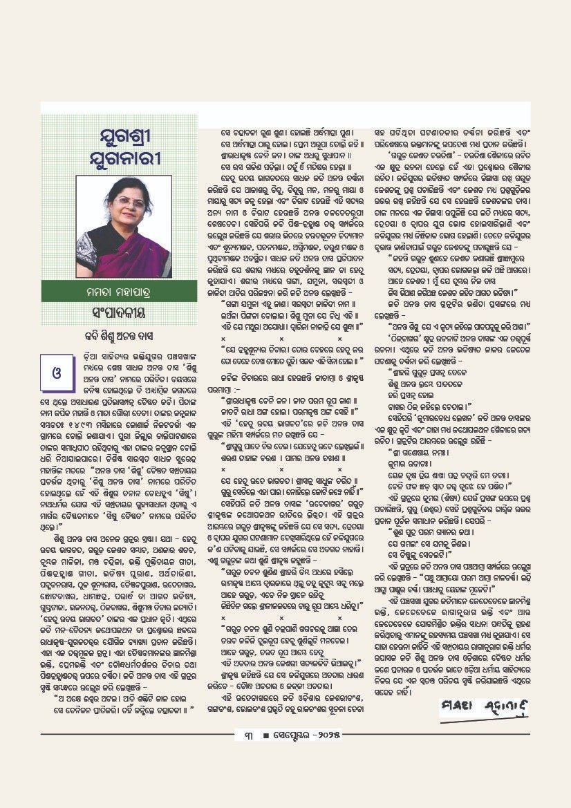 ଯୁଗଶ୍ରୀ ଯୁଗନାରୀ ମାସିକ ମହିଳା ଓଡ଼ିଆ ସାହିତ୍ୟ ପତ୍ରିକାର ସେପ୍ଟେମ୍ୱର ୨୦୨୫ ସଂଖ୍ୟାର ପ୍ରଚ୍ଛଦପଟ୍ଟରେ ଅଛନ୍ତି ସମାଜସେବୀ ଶ୍ରୀମତୀ ସରିତା ପଣ୍ଡା ।